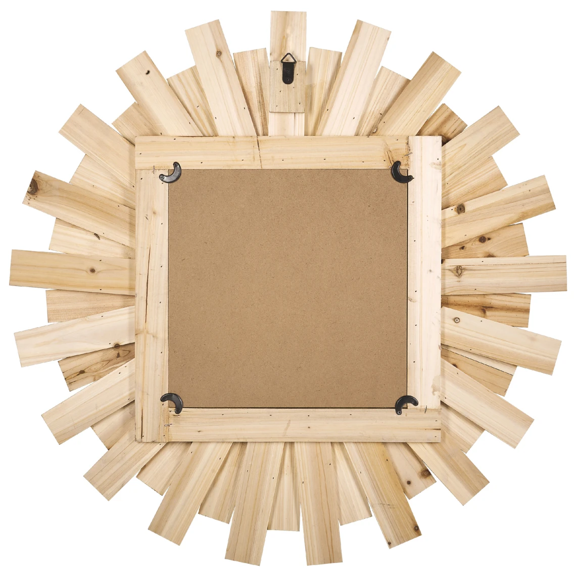 Miroir décoratif suspendu en forme de soleil. Ce miroir fait à la main apportera instantanément du style à n’importe quel mur. Avec ses planches de sapin disposées en forme de soleil, il ne manquera pas de faire sensation où qu’il soit accroché. L’aspect vieilli du cadre peint avec la structure en bois visible lui confère un charme rustique. Détails: Type de produit: Miroir décoratif Style: Rustique Couleur principale: Multicolore Type de matière: Bois solide Matière principale: Bois de sapin Matière secondaire: MDF Forme: Rond Finition: Peint à la main Orientation: Horizontal Dimensions: Profondeur: 2 cm Largeur: 75 cm Hauteur: 75 cm Poids: 2.8 kg L`offre inclue: 1 x Miroir Caractéristiques clés: Cadre équipé de crochets de suspension pour accrochage au mur , Décoratif et fonctionnel, Solution parfaite pour la chambre et le salon, Agrandit l’intérieur visuellement, De haute qualité, Finition précise Informations d`assemblage: Ne nécessite pas d’assemblage Informations supplémentaires: L’effet d’usure, l’aspect vieilli ou taché de ce produit sont intentionnels et ne peuvent pas être considérés comme défauts de fabrication. Le produit étant fabriqué à partir de matériaux naturels, chaque modèle présente des variantes de couleurs différentes. Comme il est fabriqué à la main, nous ne pouvons pas garantir que le produit correspondra à la pièce présentée sur la photo. Conseils de maintenance: Bois de sapin: 1.Essuyez immédiatement après le nettoyage pour empêcher l’eau de s’accumuler sur les meubles 2.Nettoyez avec un chiffon et un nettoyant doux dans le sens du grain du bois 3.De temps en temps, il est conseillé de mettre une nouvelle couche d’huile sur les meubles avec une finition huilée.