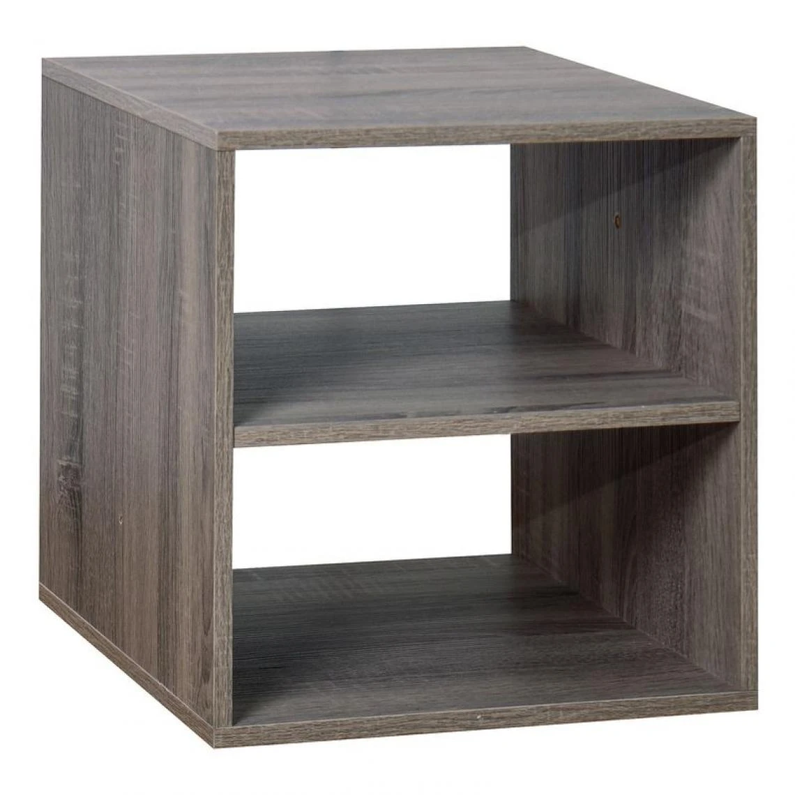Finition :papier décor imitation chêne foncé. . Structure :panneaux de particules. . Dimensions en cm :L. 35,7 – H. 35,8 – P. 38,2. Espaces de rangement : 2 x L. 33,1 – H.16,1 – P.38.2 cm. .