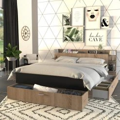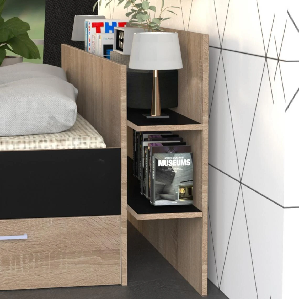 Points forts Le Quai Des Affaires Lit SAMBA 140x190cm + tête de lit + 2 tiroirs / Noir & chêne blanchi