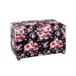 Coffre de rangement en MDF recouvert velours (Motif Black Rose), siège rembourré et rabattable. Dimensions : L 65 x P 40 x H 42 cm