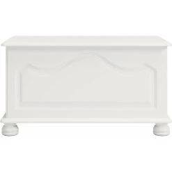 Le coffre de rangment en pin massif coloris blanc, et il est conçu avec un couvercle et un compartiment avec un espace pour les bibelots et les vêtements.