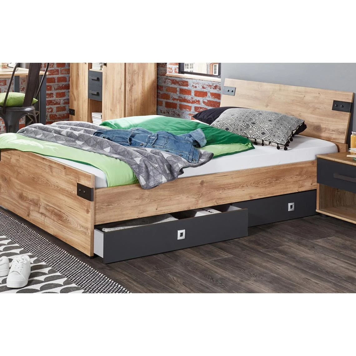 Points forts Pegane Lot de 2 tiroirs Imitation chêne poutre, rechampis graphite – 100 x 16 x 60 cm